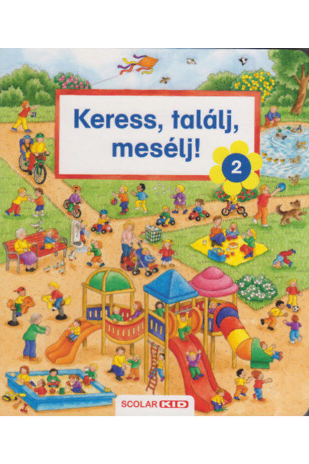 A második Keress, találj, mesélj! képeskönyv oldalai rengeteg keresni-, találni- és mesélnivalót rejtenek. Piac, óvoda, építkezés, orvosi rendelő, strand, állatkert, bevásárlóközpont, vasútállomás – mind-mind izgalmas, felfedezésre váró helyek az apróságok számára.