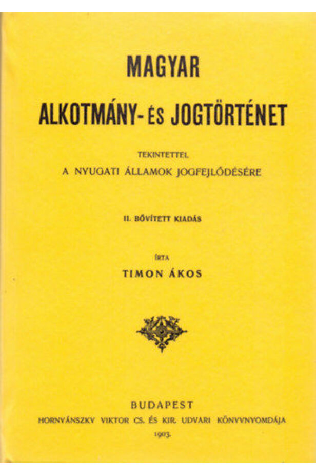 Timon Ákos jogtörténész a jelen munkájában a magyar jogrendszer fejlődését tekinti át, összevetve nyugat-európai példákkal. írta Timon Ákos. 3., bőv. kiad. Budapest :Hornyánszky Viktor Könyvkiadóhivatala, 1903.